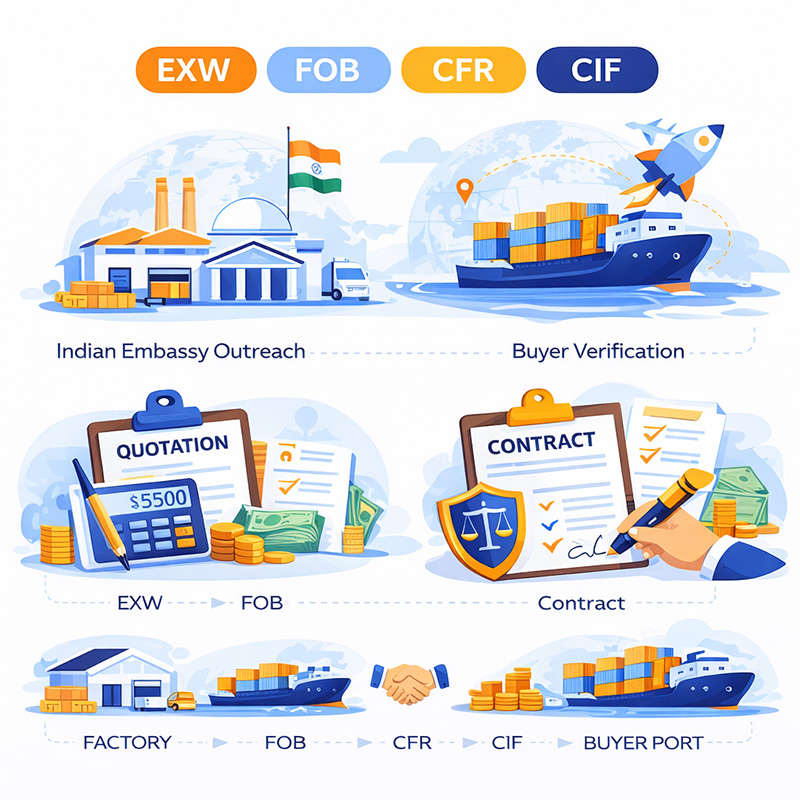 Using ITC Trade Map — which Parth deExport is a patient game — Parth will tell you this directly. But when a response comes, you won't be scrambling. You know how to price a quotation correctly, what payment terms to propose, how to structure a contract that protects you, and what happens from loading a container to payment landing in your account. mos live — you can now find your product's HS code, see which countries import the most of it, track its five-year growth curve, and understand where India sits competitively. This used to feel like it required a consultant. After this workshop, it's an afternoon's work, free.